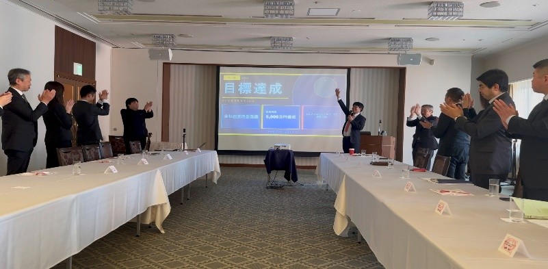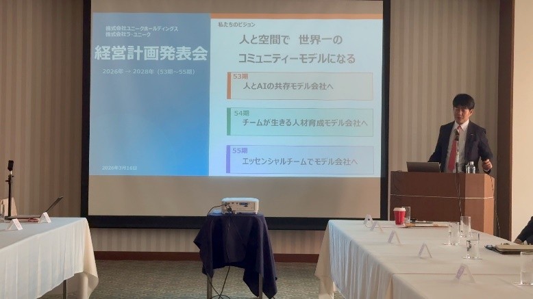 2026年3月16日、「経営計画発表会 2026」を開催致しました。発表会では、まず53期(2026年度)〜55期(2028年度)に向けた3ヵ年ビジョンを示し、続いて50〜52期の売上・営業利益の推移をスクリーンに提示しながら、着実に成長していることを強調しました。また、チームメンテナンスで解決すべき4つの社会課題を紹介し、人材育成・チームメンテナンス・社内システム・営業拡大の4つを重点戦略として掲げました。