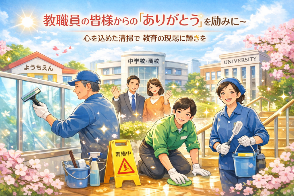 ~教職員の皆様からの『ありがとう』を励みに~ 2月の冷たい風が吹く中、このたび新たに受注いたしました幼稚園・中学校・高等学校・大学における清掃・校務業務(ビルメンコンシェルジュ®)が、 2月よりスタートいたしました。 …